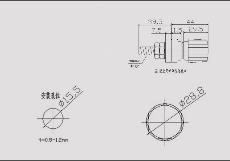 中间绝缘部分:上端高度12.5mm, 外部直径28.5mm,嵌入直径17.5*5mm椭圆螺母,中间是直径15.5mm的安装孔.下端高度14mm,外部直径28.5mm, 嵌在上端绝缘体直径为15.5mm(开孔直径)*高8mm。